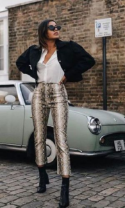 Δοκίμασε ένα δερμάτινο παντελόνι με όψη από δέρμα φιδιού για μια πολυτελή και fashionable εμφάνιση.