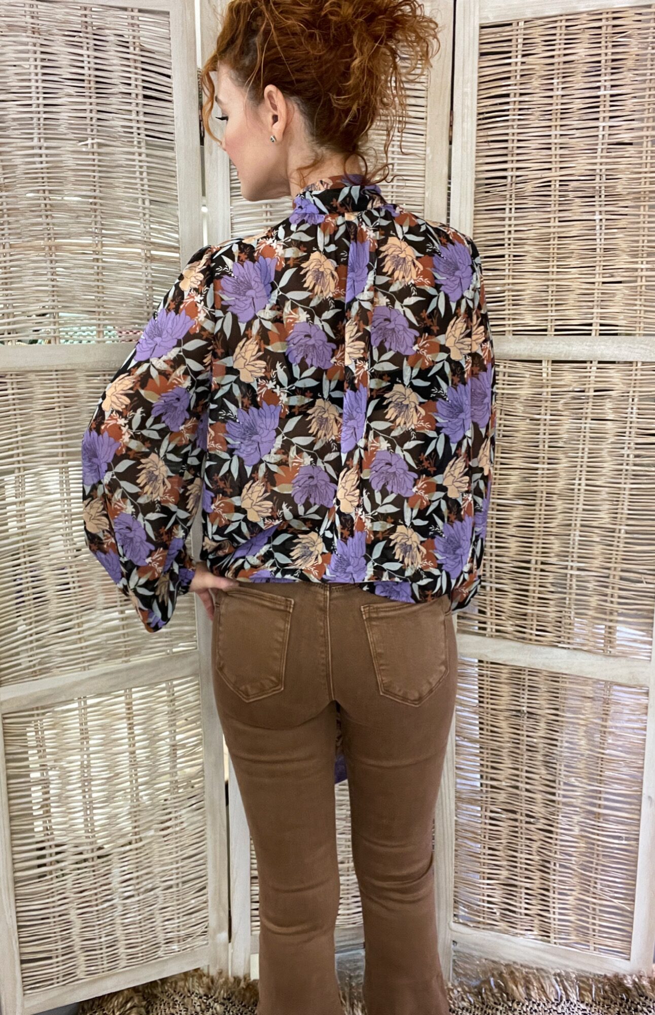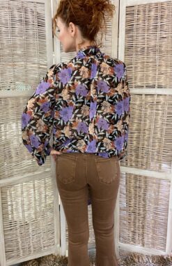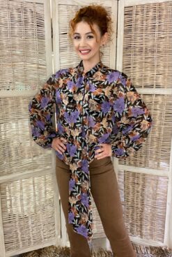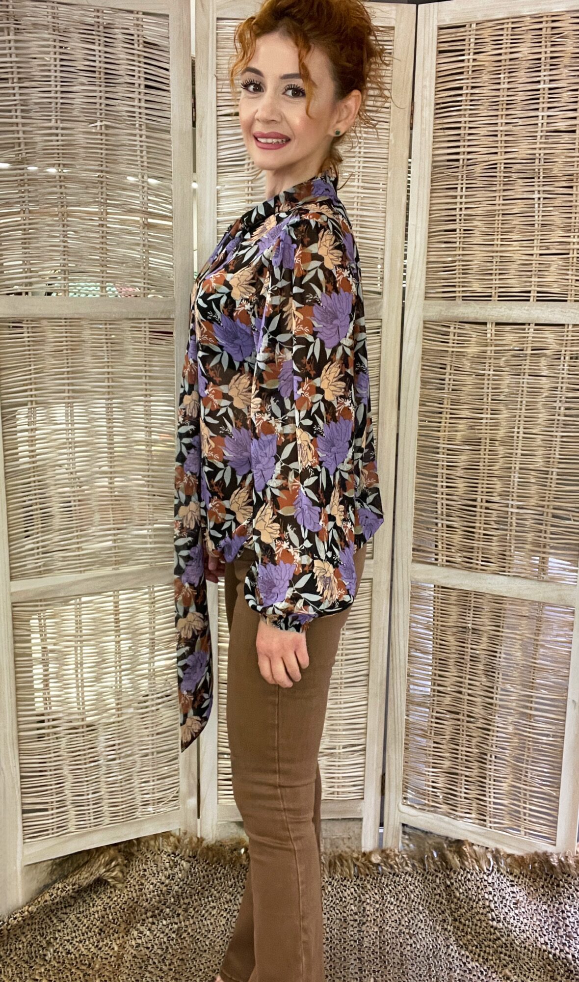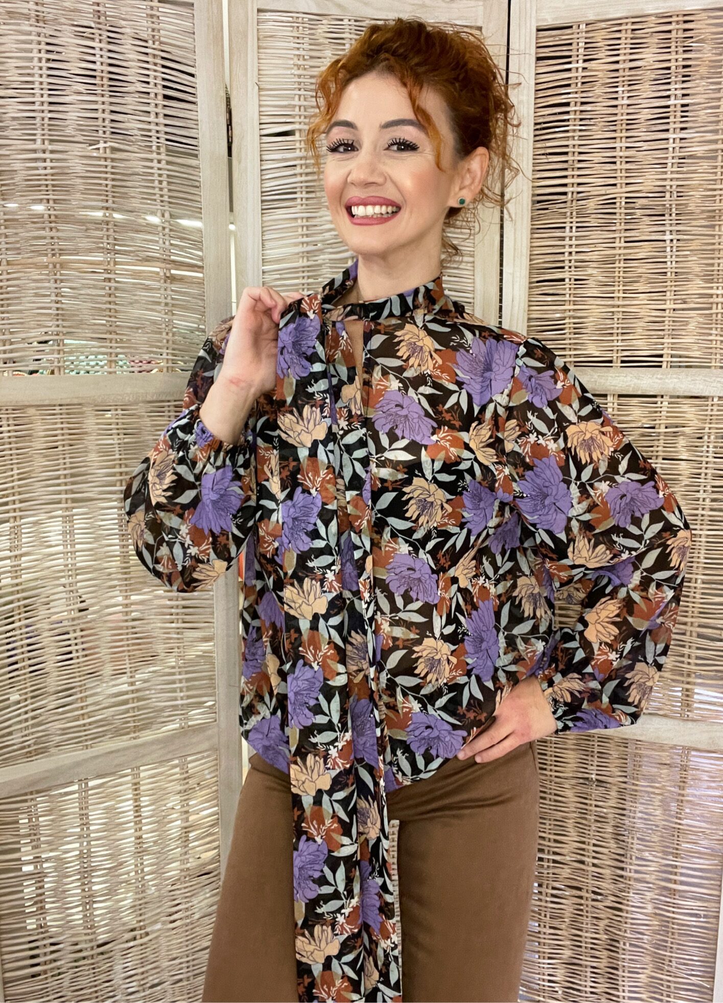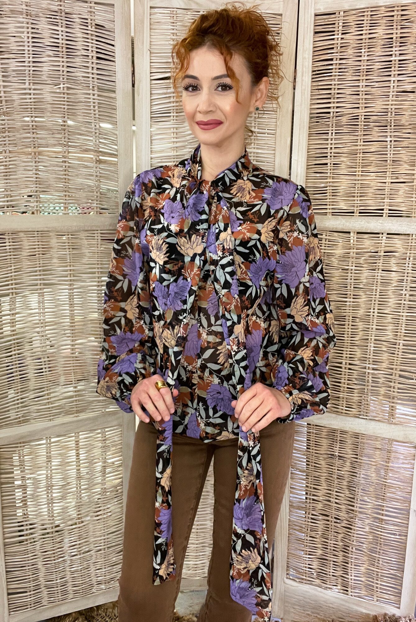 Πουκαμίσα με γεωμετρικά σχέδια και φιόγκο στο λαιμό ,στις αποχρώσεις του μωβ και του εκάι.